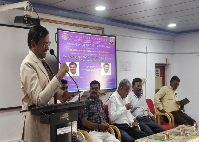 The One-Day Awareness Programme on the theme “Contemporary Social Issues and Problems – SC/ST and Minorities in India” was conducted on 25 March 2025 at 10.15 a.m. at the Placement Conference Hall, Alagappa University. The event featured expert lectures by Dr. S. Rajamohan, Former Registrar (i/c) and Director, AIM, Alagappa University, and Dr. R. Mangaleswaran, Professor, Department of Social Work, Bharathidasan University, Trichy, who shared valuable insights on the challenges, opportunities, and contemporary concerns faced by marginalized communities in India.